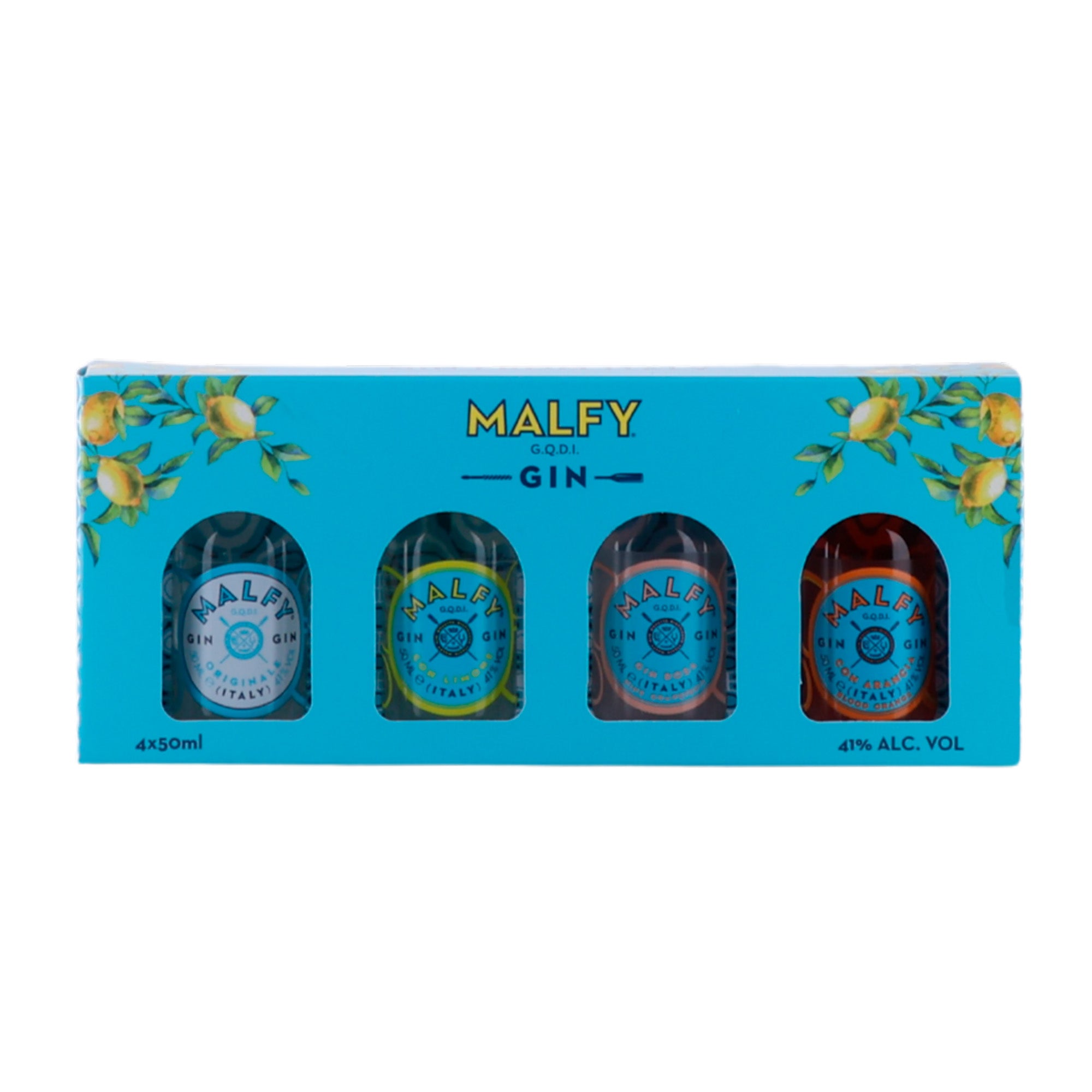 Gaveæsken indeholder fire styks 50ml Malfy Gin miniature flasker.