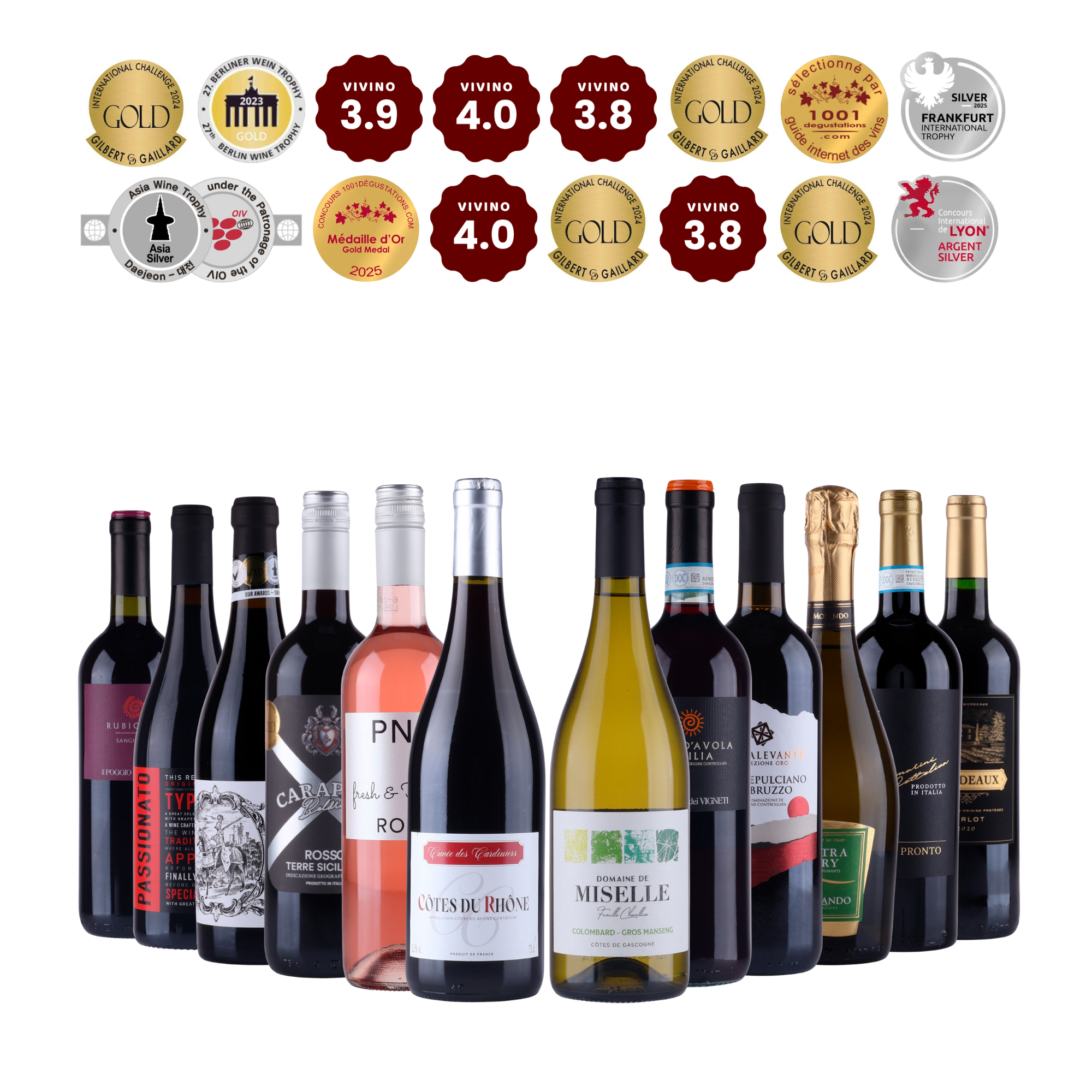 Vores luksus 12 stk. kasse er sammensat til dig, der vil have vine med dokumenteret kvalitet. Her får du et udvalg af vine, der tilsammen har opnået et imponerende antal medaljer ved internationale smagninger og høje Vivino-scores fra vinelskere verden over.