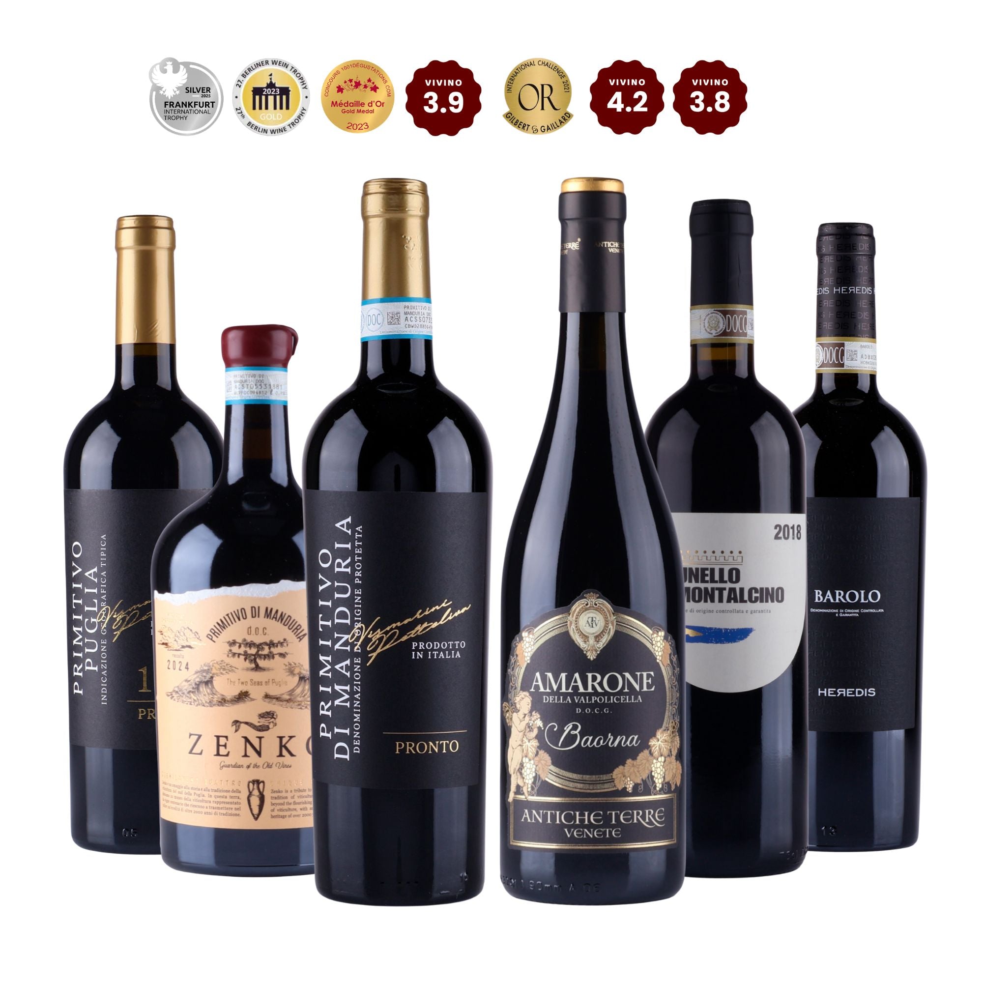 Kassen indeholder seks eksklusive vine fra nogle af de mest berømte vinområder i Italien, herunder kraftfulde Primitivo fra Manduria, dybe Amarone fra Veneto, og den elegante Barolo fra Piemonte. Hver flaske fortæller sin egen unikke historie, og samlingen tilbyder en smagsrejse gennem intensitet, fyldighed og harmoni.